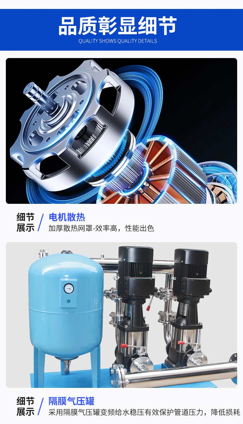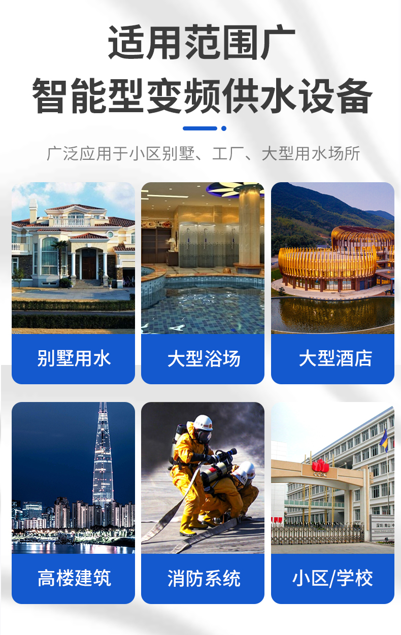 1、新建的住宅小區(qū)、別墅、寫字樓、綜合樓生活供水。2、高層建筑、消防用水、高級(jí)賓館飯店等的生活供水。
