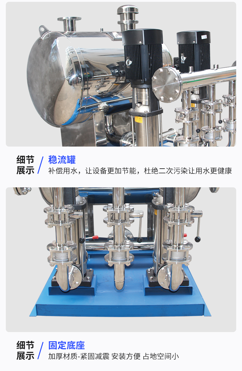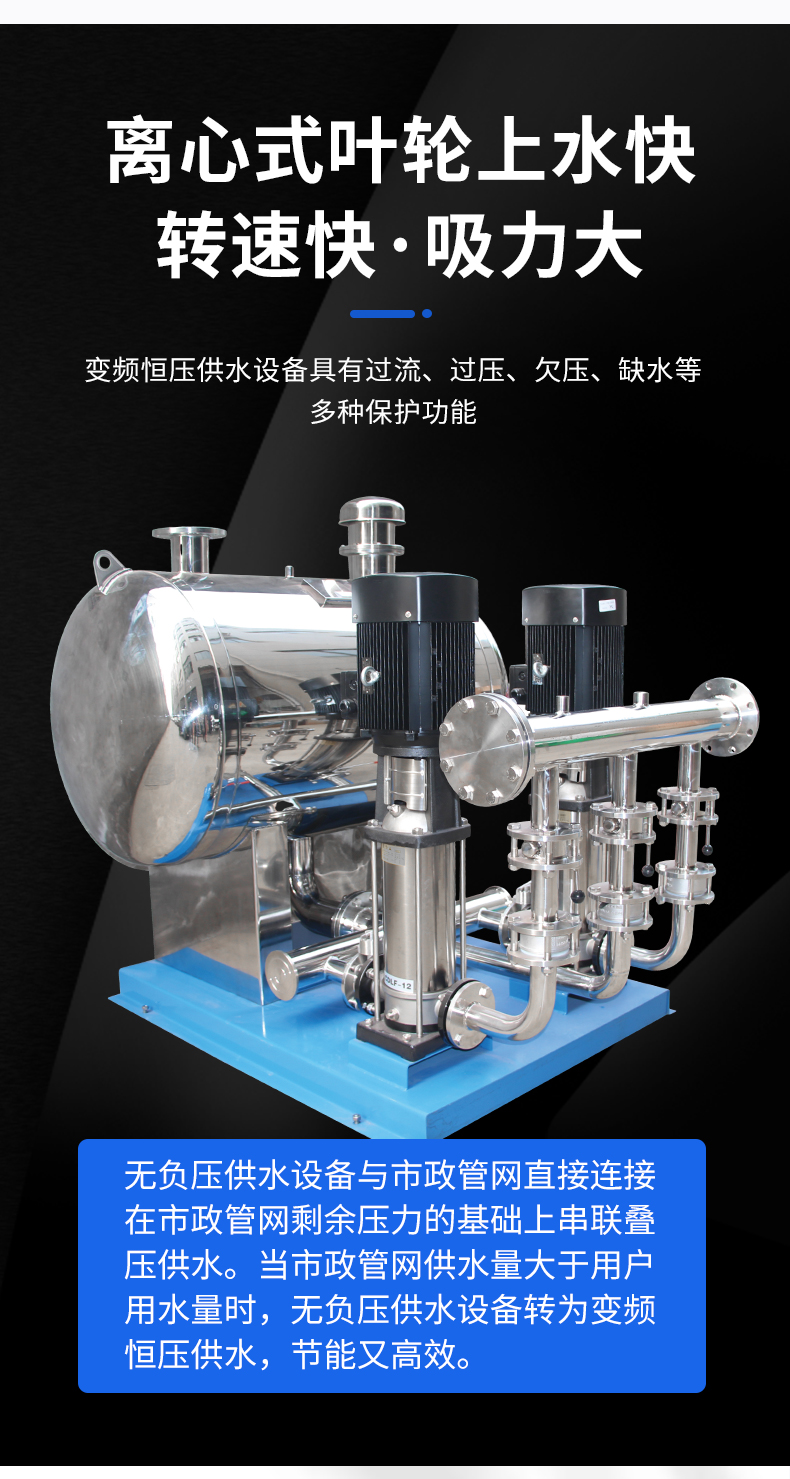 1. 變頻技術(shù):采用變頻器實(shí)時(shí)調(diào)整水泵轉(zhuǎn)速,保障水壓穩(wěn)定恒定。變頻供水設(shè)備基本特性就是恒壓,很多場(chǎng)合之所以要采用變頻供水主要因素就是變頻供水設(shè)備可以實(shí)現(xiàn)變流量的恒壓供水同時(shí),可根據(jù)用戶需求調(diào)整供水壓力,滿足不同用戶的使用需求。